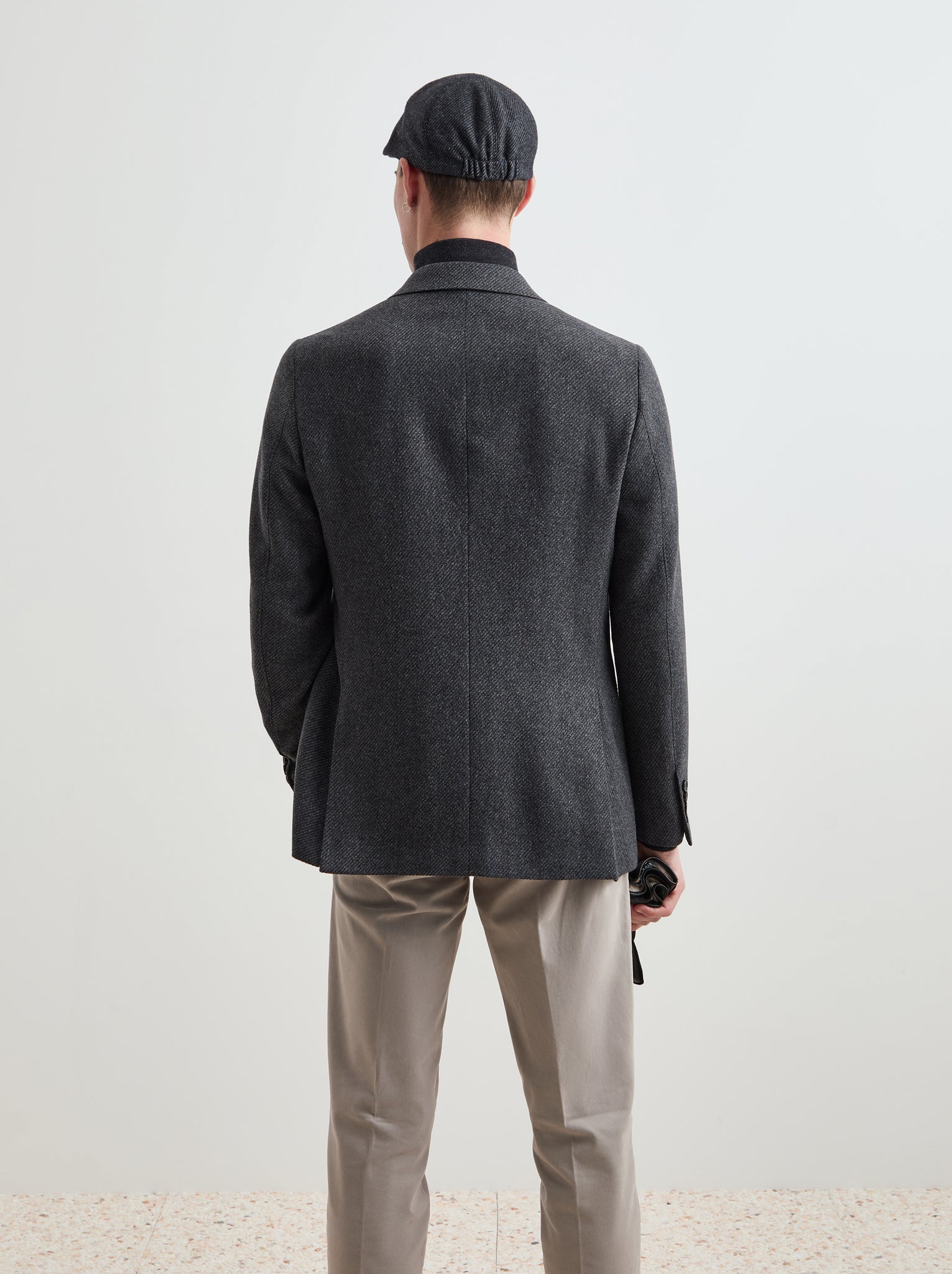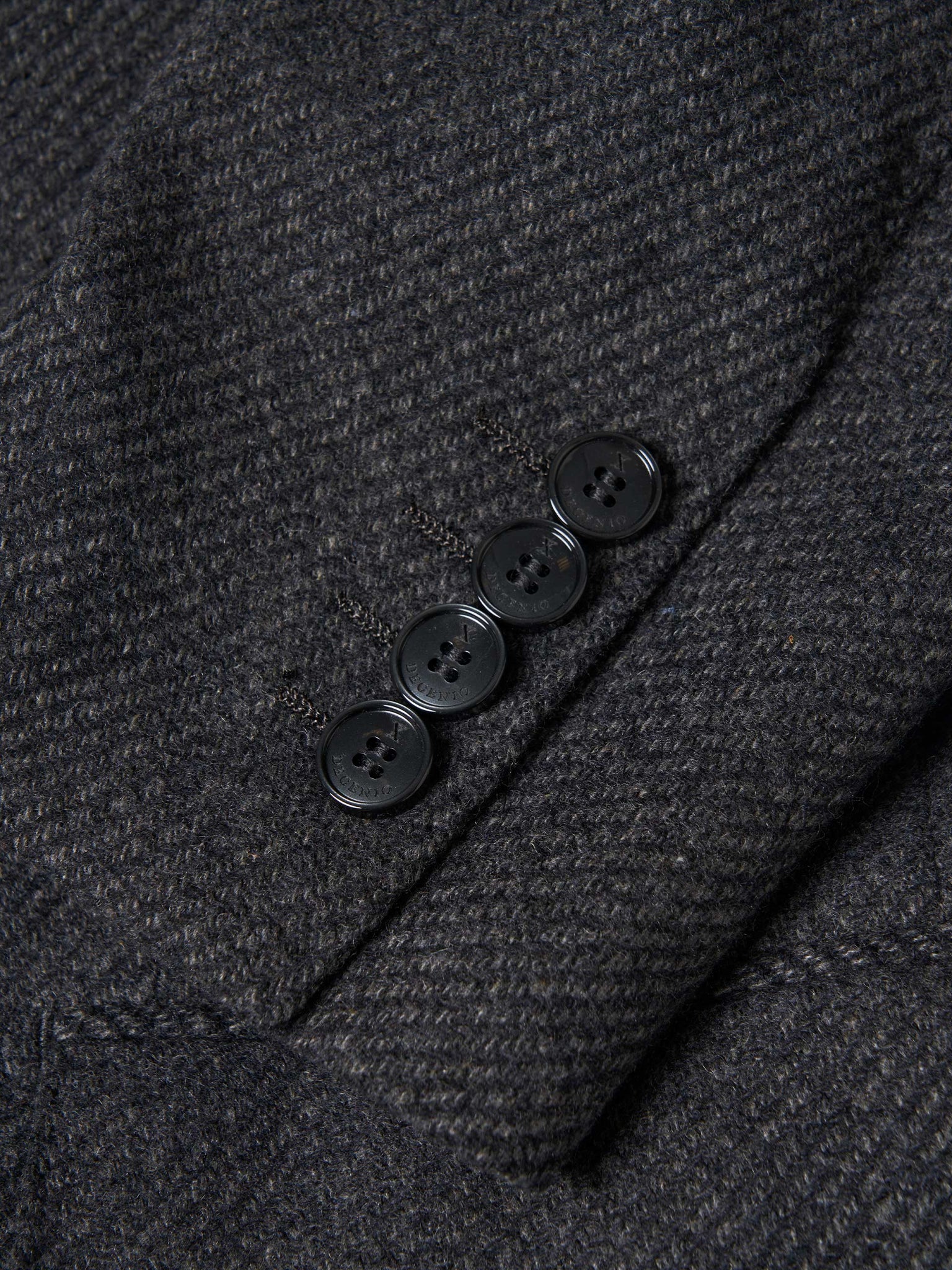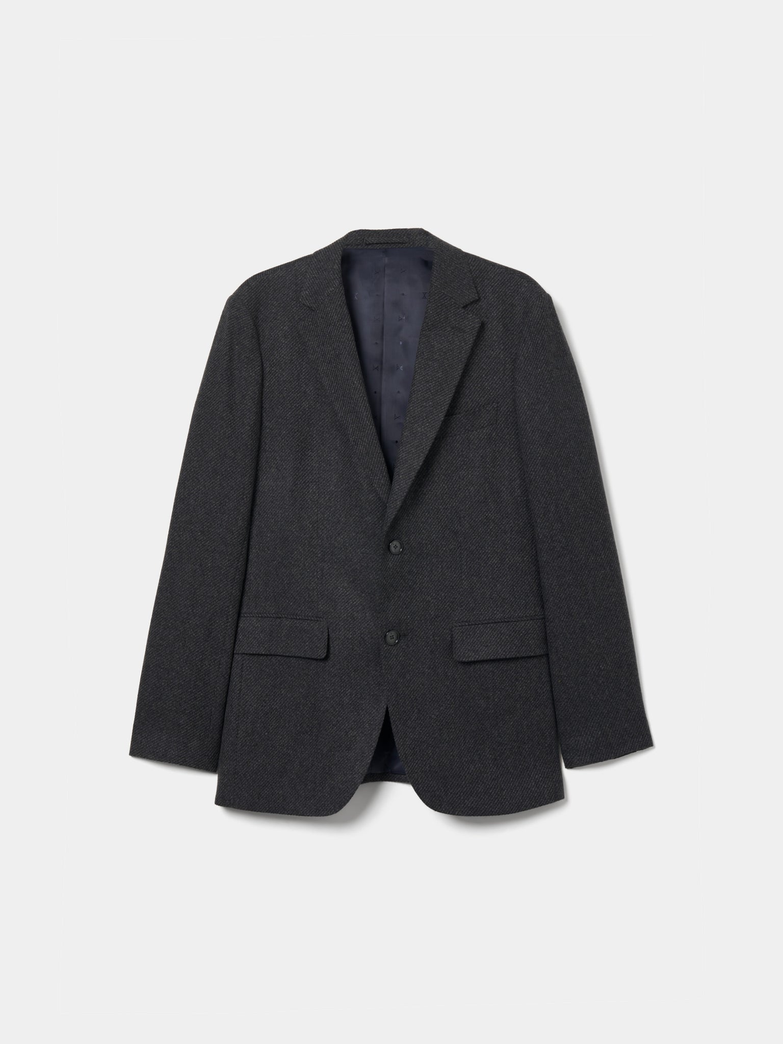 Fecho de dois botões garante um corte tradicional e intemporal, enquanto o forro personalizado com o logótipo da marca adiciona exclusividade e distinção ao design.