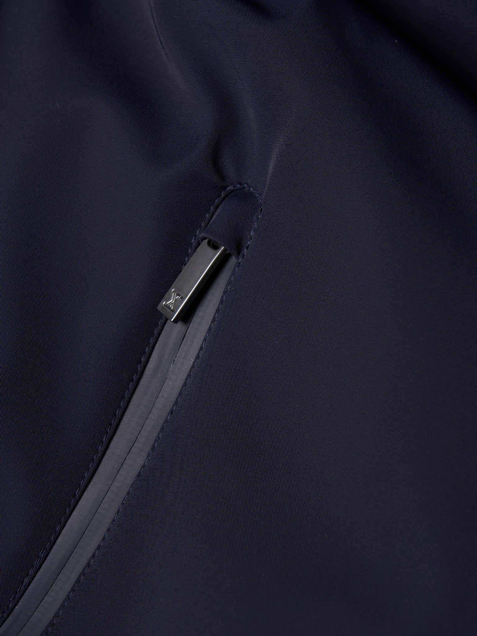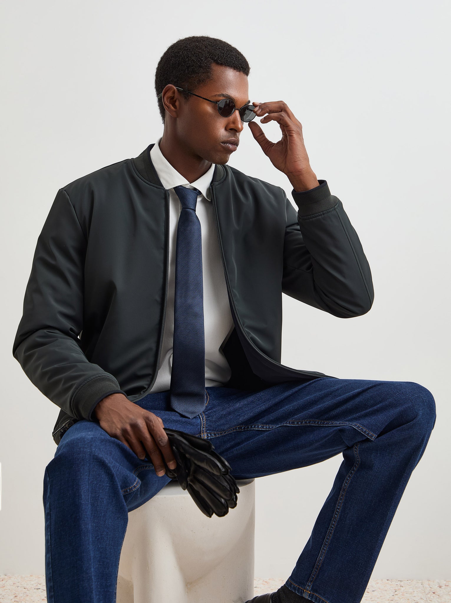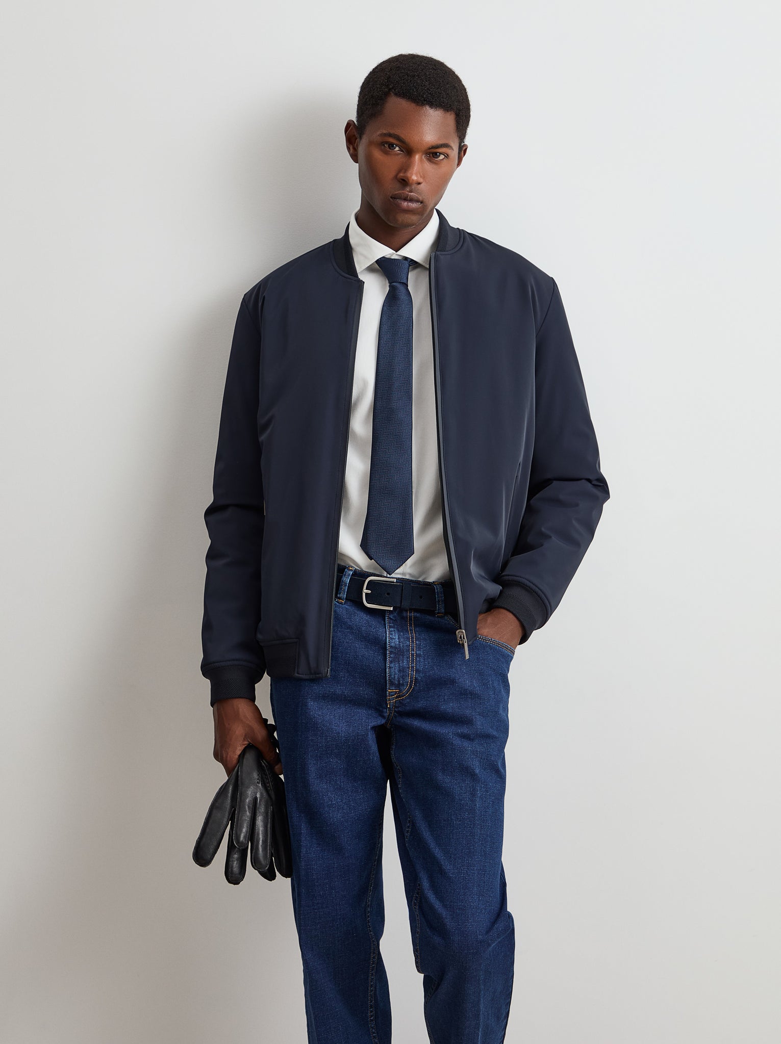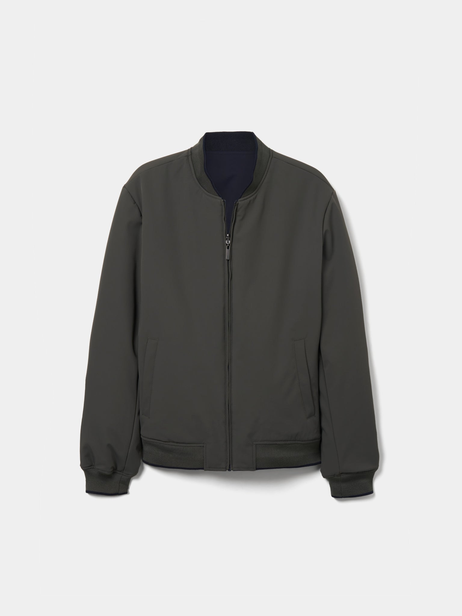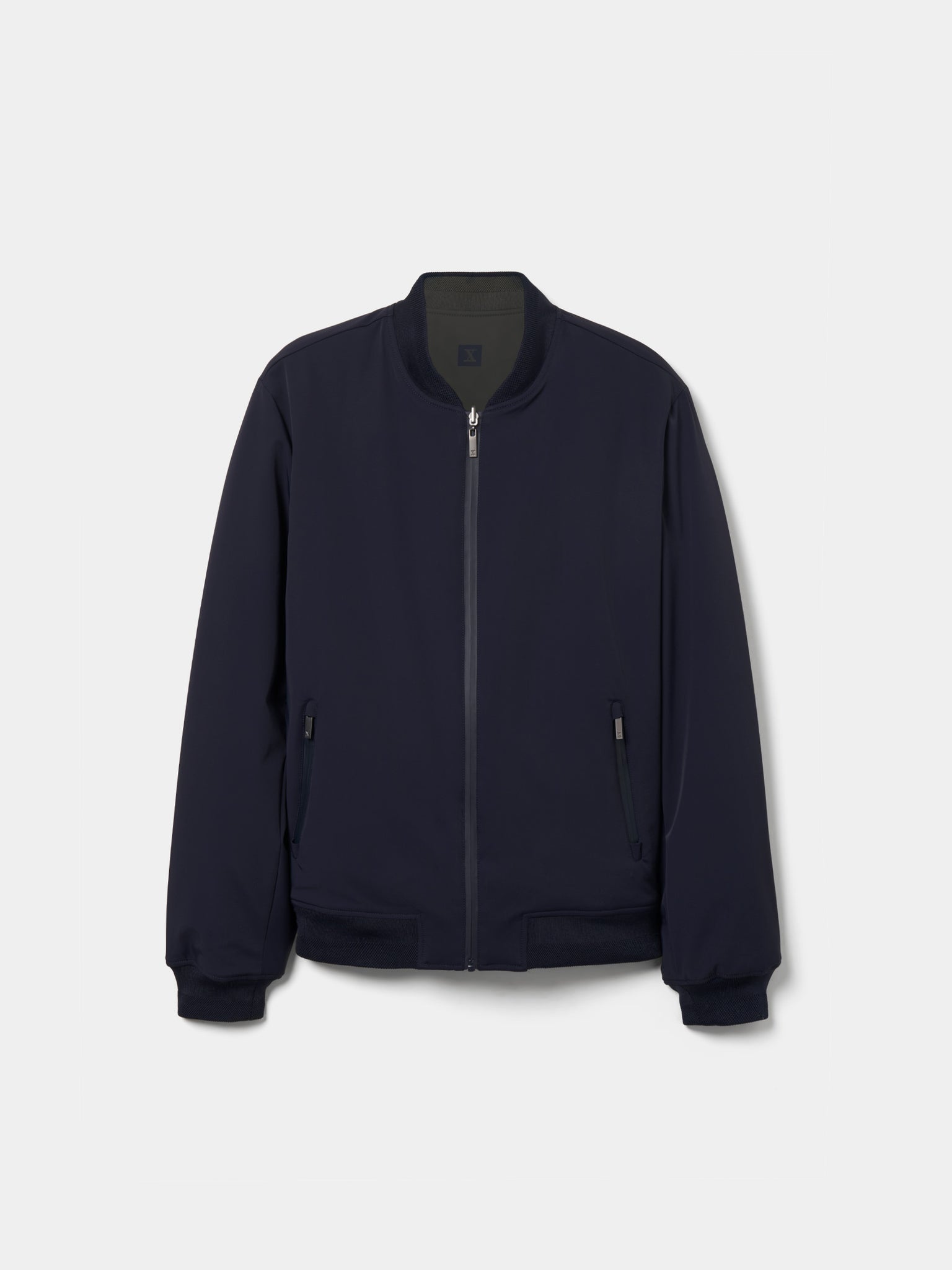 Bomber reversível com dois tons, azul de um lado e cinza do outro, confecionado em tecido técnico leve e flexível, pensado para oferecer conforto e liberdade de movimento.