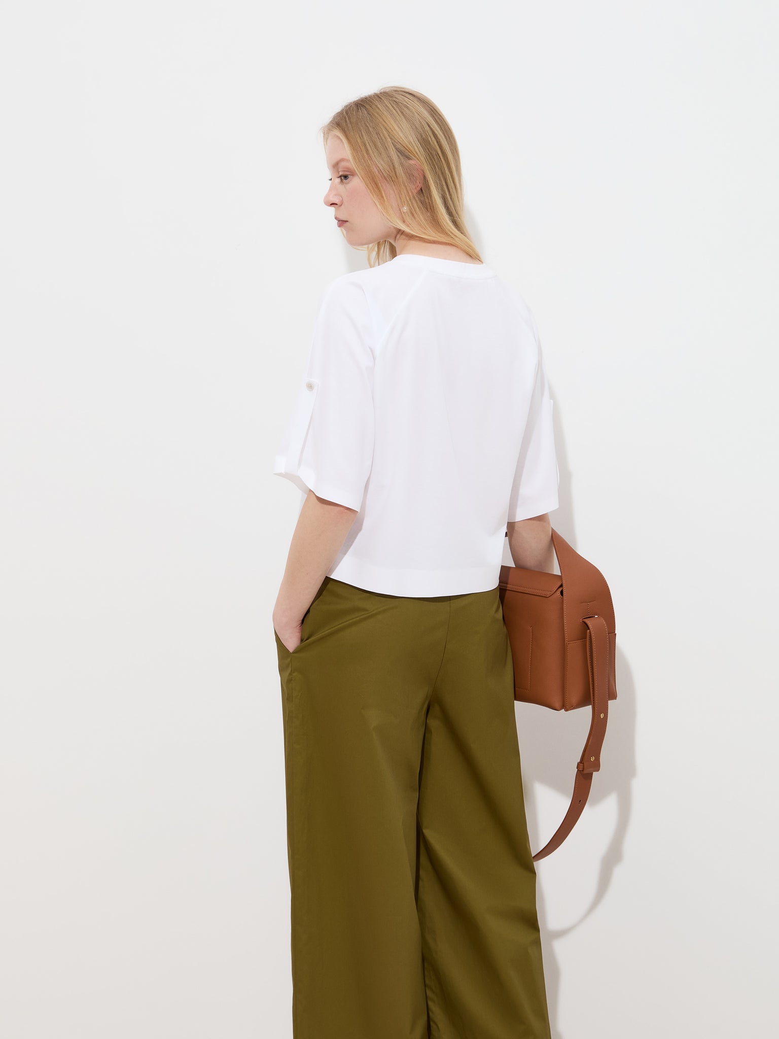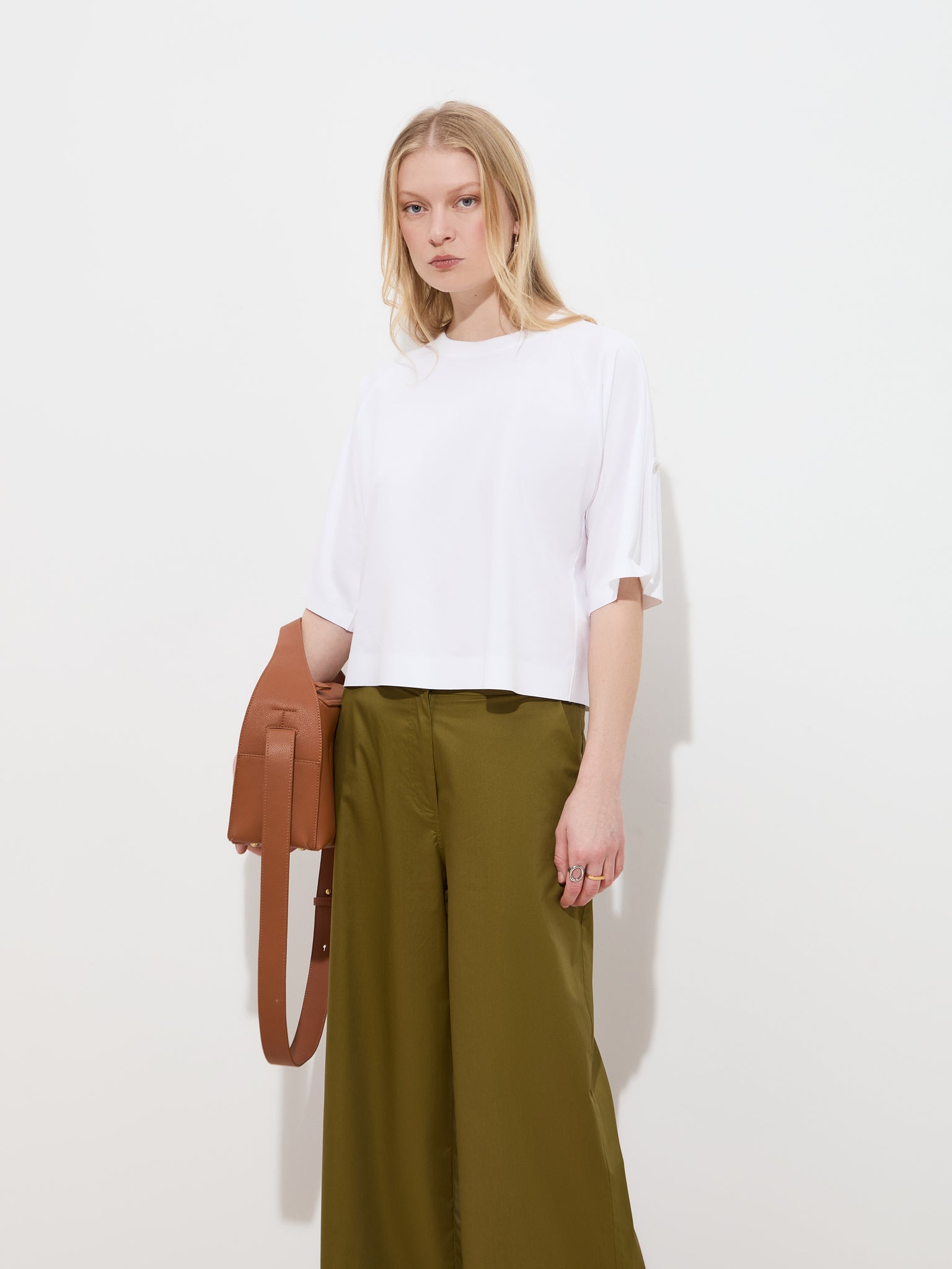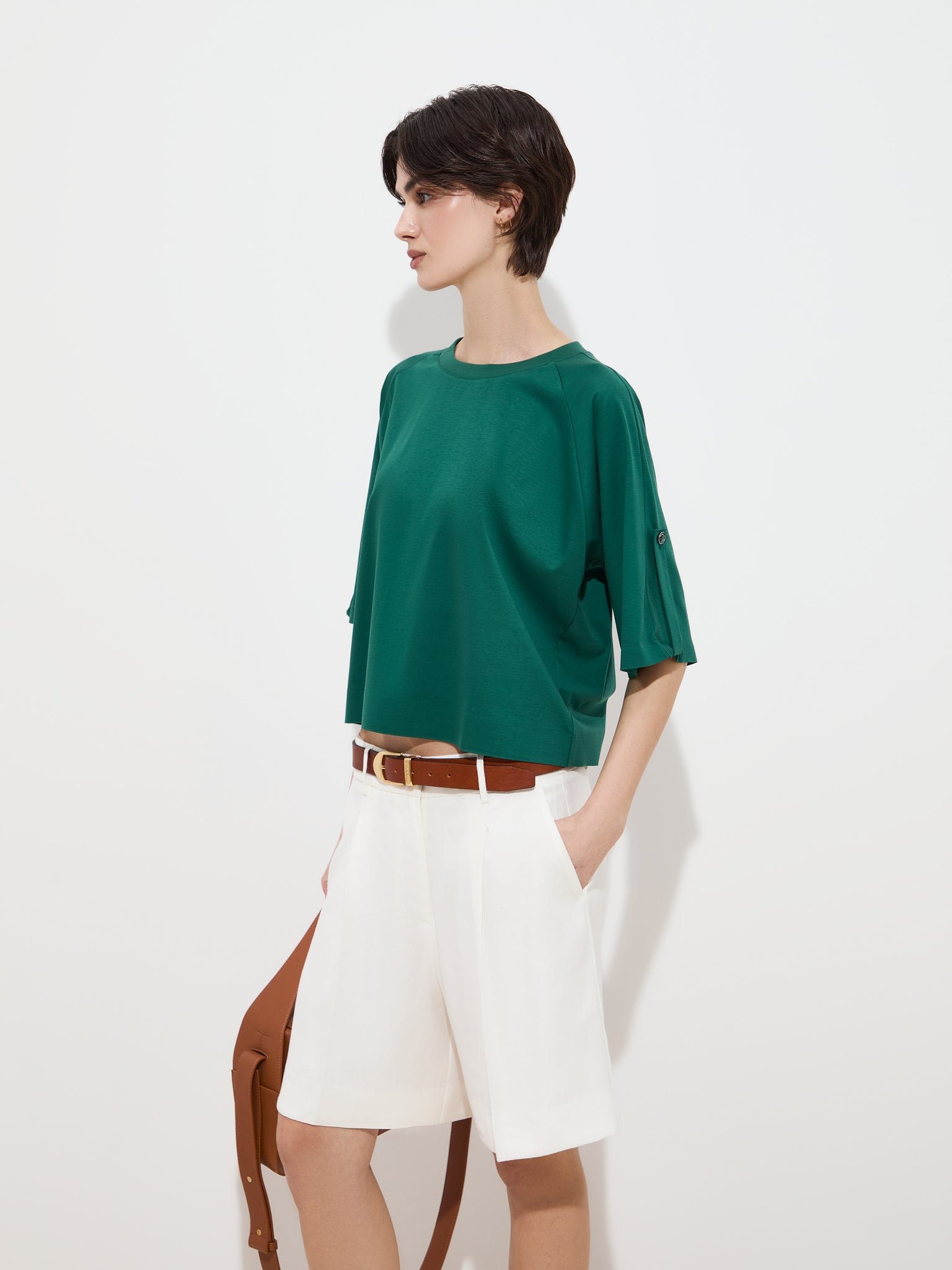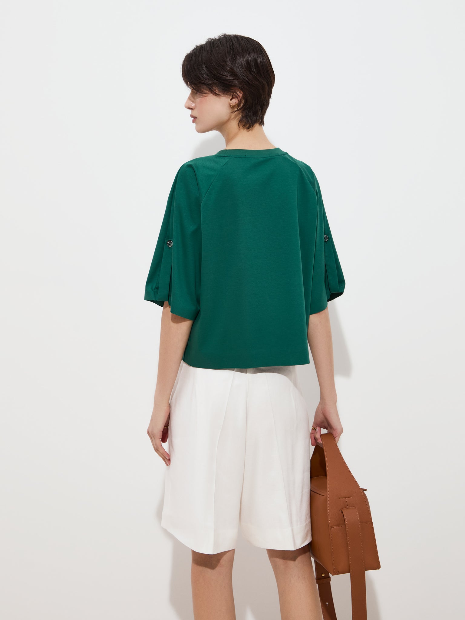 Decote redondo e mangas de comprimento médio que se destacam pelo detalhe de presilha.