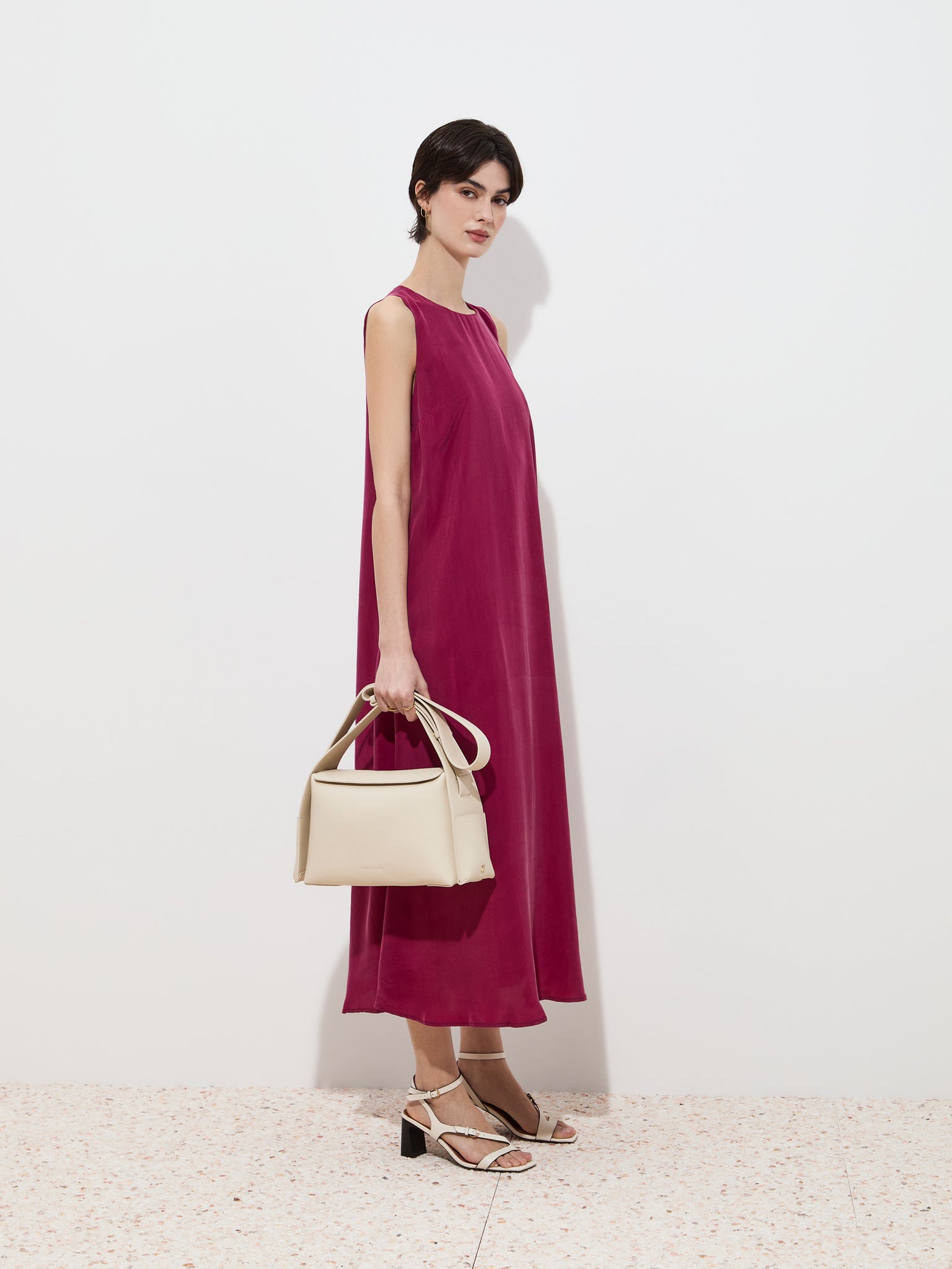 Vestido midi sem mangas, com decote redondo e um cair fluido que confere leveza e conforto ao vestir.