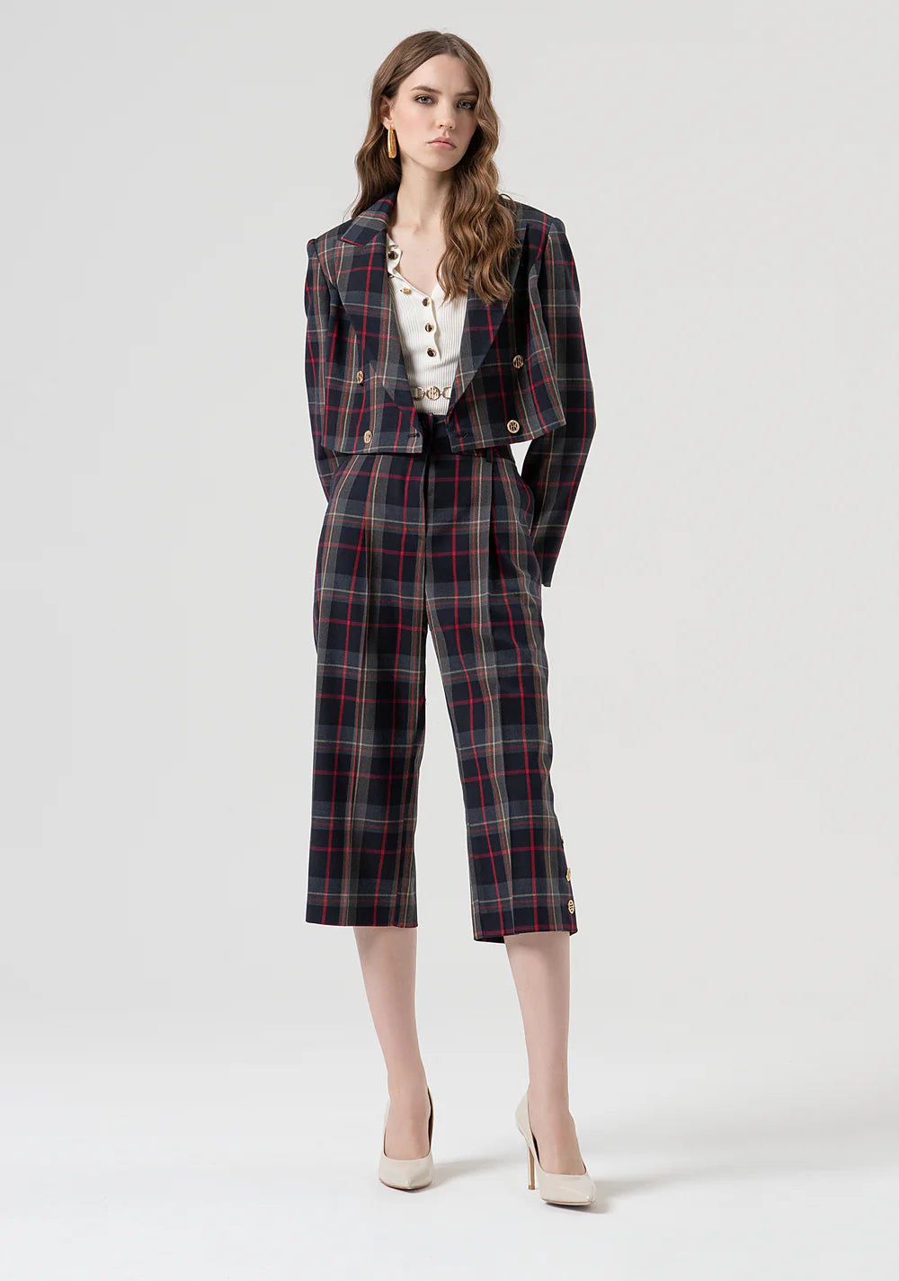 Blazer cropped abotoado duplo com estampa xadrez.